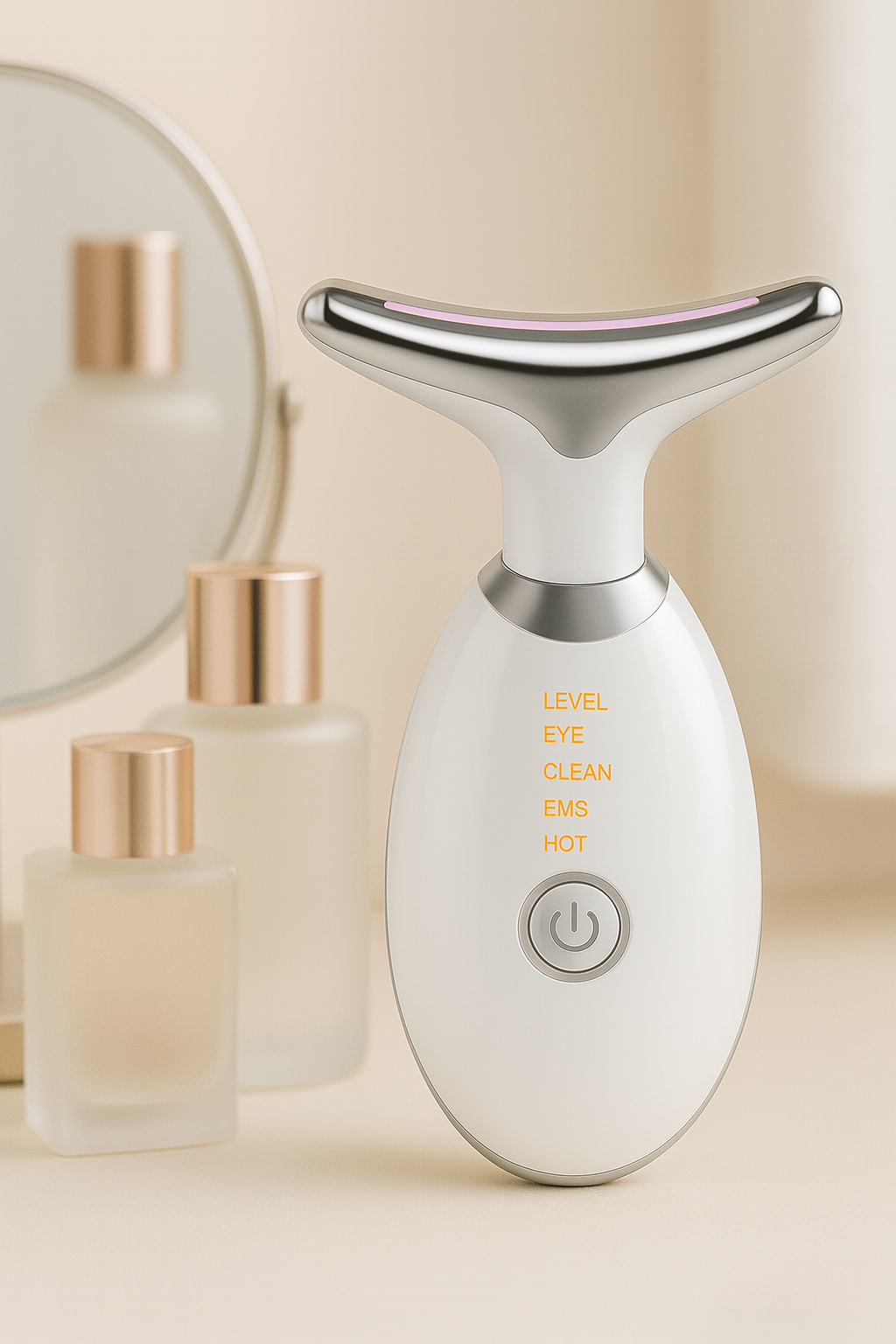 - Technologie lumineuse à 7 couleurs : chaque teinte offre un effet distinct — rouge pour la fermeté, bleu pour les imperfections, vert pour un teint plus uniforme.